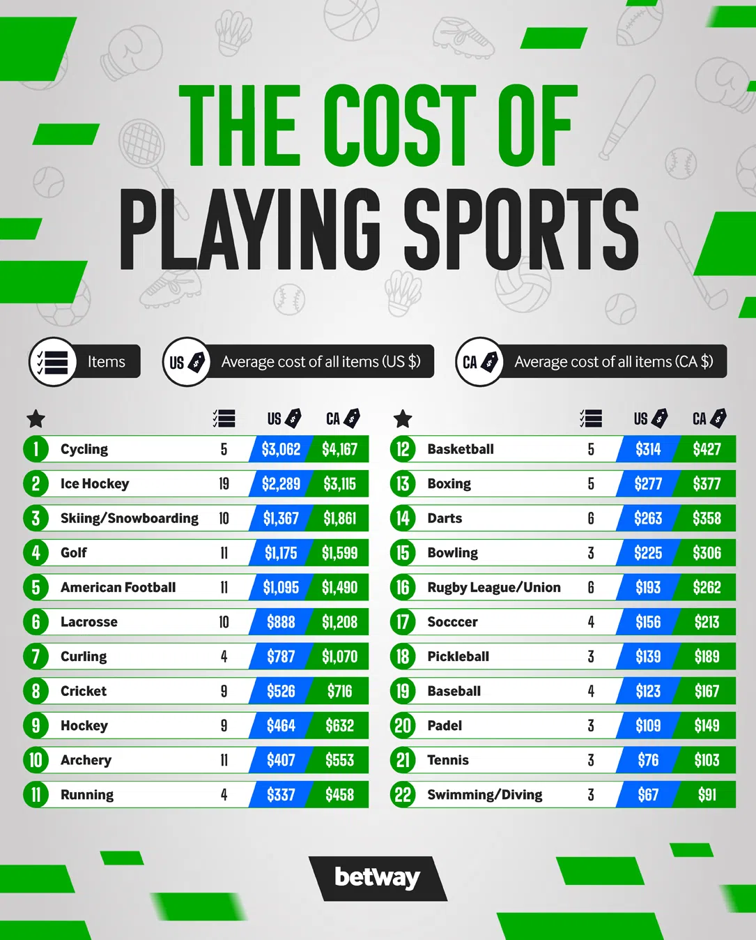 To uncover the underlying cost, the team at Betway created an index. Taking into account all the equipment needed to play and working out the sum of their values, we’ve ranked 22 different sports in order of most to least expensive. Keep reading to find out the actual cost of participating in sports in North America.