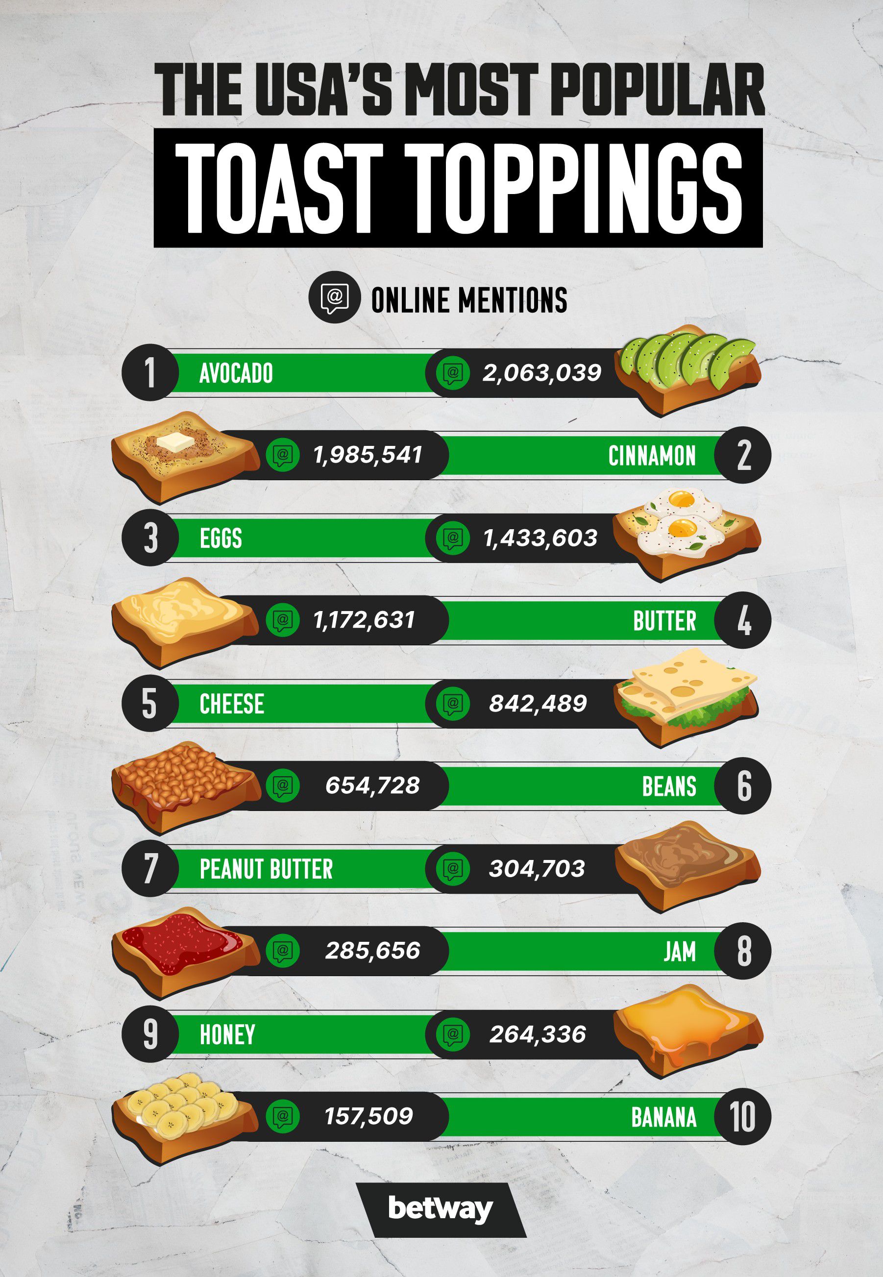 Taking seventh and eighth in the US, we have peanut butter (304,703) and jam (285,656), while honey (264,336) and banana (157,509) round out our list of the ten most popular toast toppings in America.