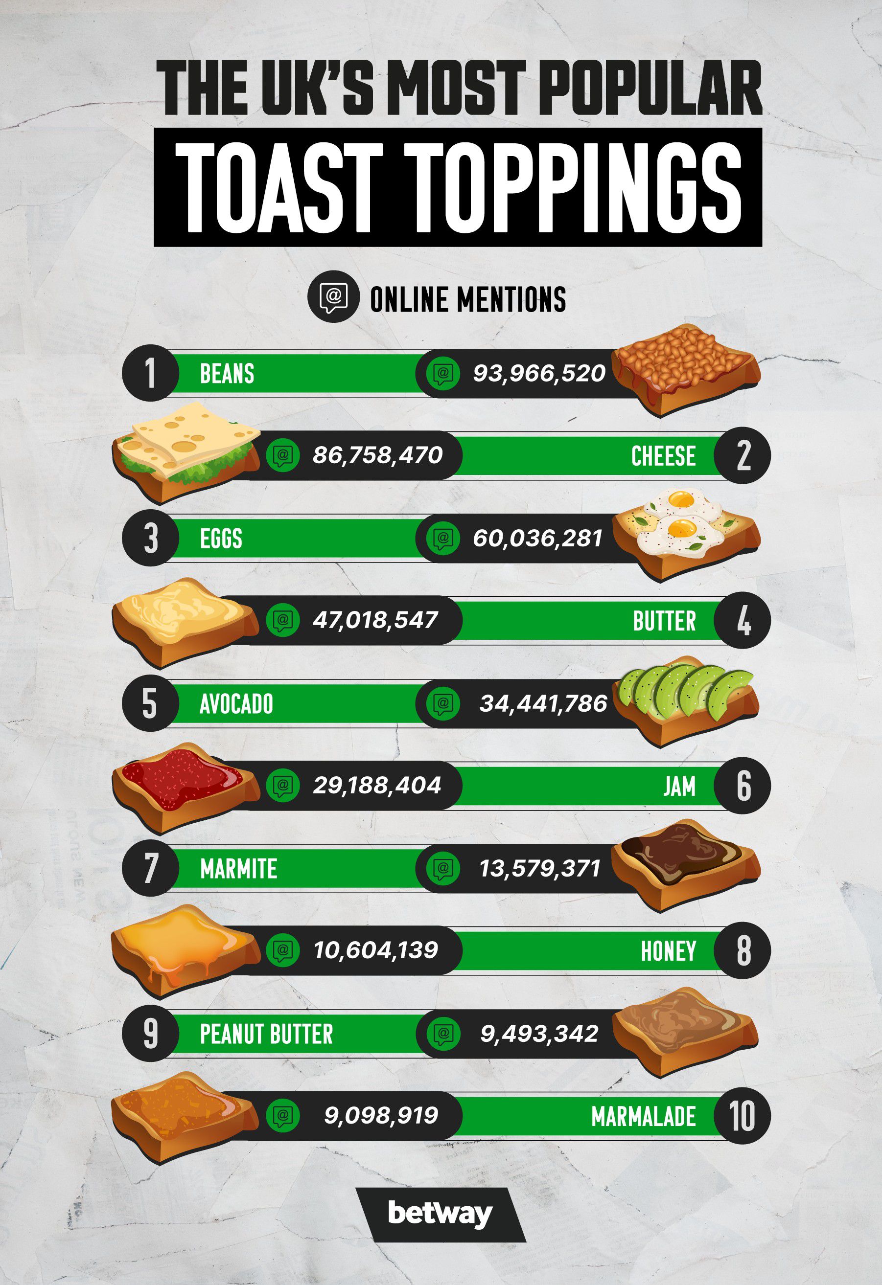 With National Toast Day looming, online casino Betway ranked the most popular toppings around the world, from beans and cheese to peanut butter and jam. But not only that; we wanted to see how favourite toast accompaniments differ between the UK and US!