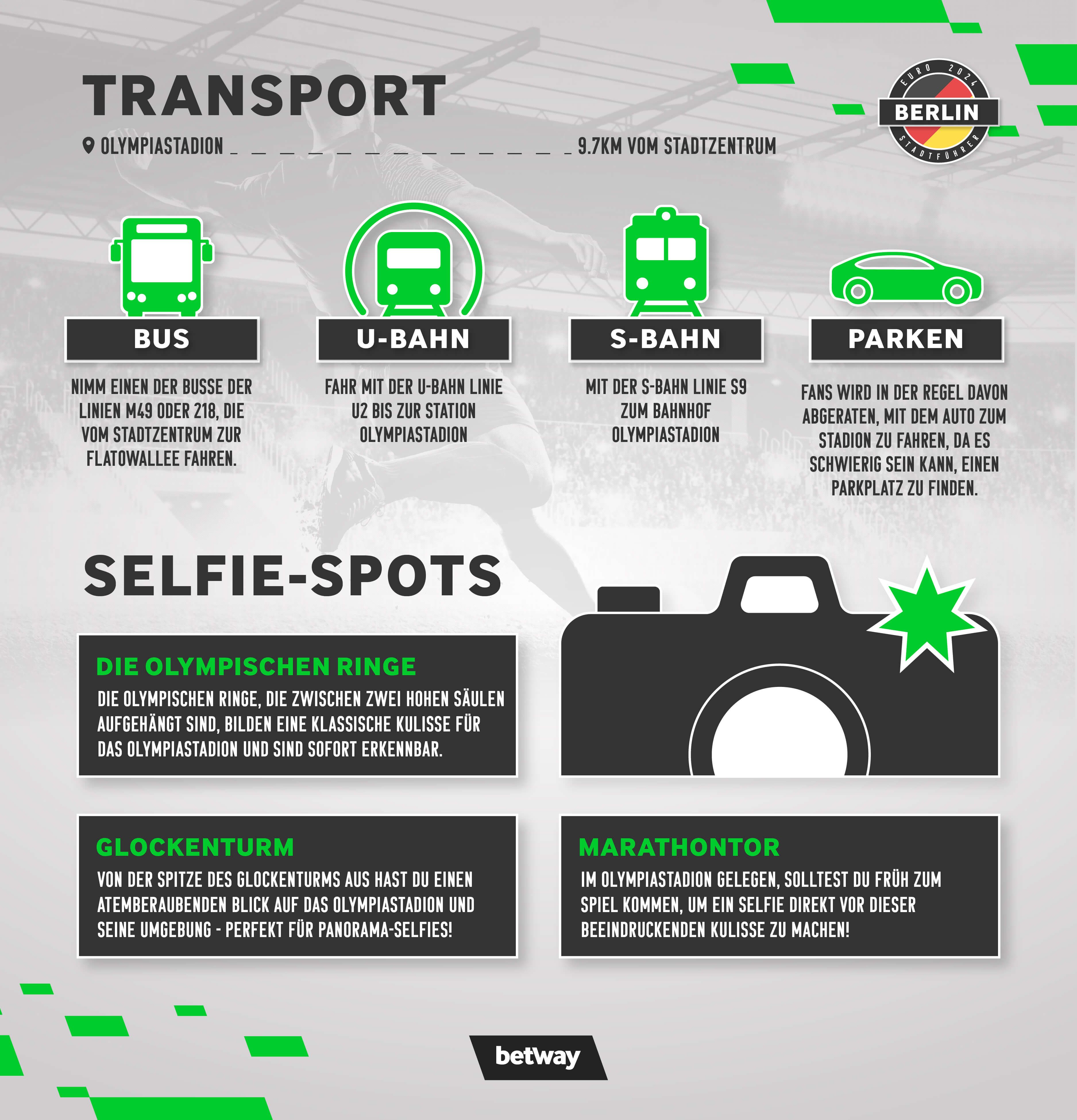 Das Olympiastadion liegt außerhalb des Stadtzentrums und ist mit dem Auto erreichbar. Die offizielle Empfehlung für Fans, die Berlin besuchen, lautet jedoch, an Spieltagen nicht mit dem Auto zum Stadion zu fahren, da die Parkplätze in der Regel belegt sind und es schwierig sein kann, einen Parkplatz zu finden.