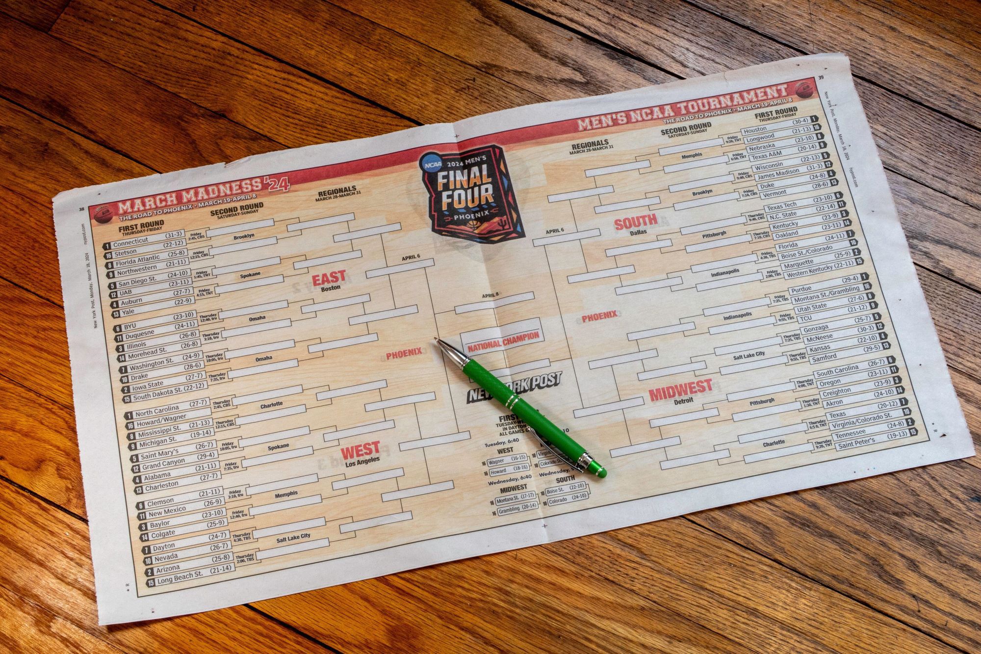 Los equipos se clasifican del 1 al 16 según su desempeño durante la temporada regular y los torneos de conferencia. El equipo con la clasificación más alta en cada región juega contra el equipo clasificado en el puesto 16, el segundo clasificado juega contra el decimoquinto clasificado, y así sucesivamente.