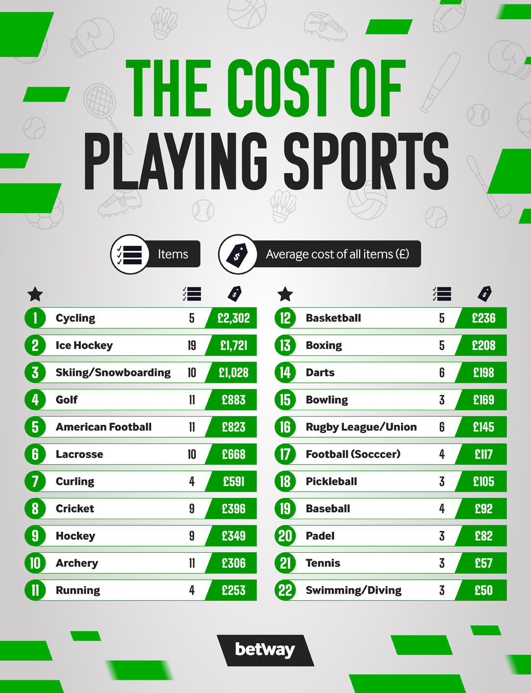 So, to discover the real fees needed to play in the UK, the team at Betway conducted research into the average price of various pieces of kit and items required to participate in 22 sports. Read below to find out the true cost of playing different sports across the UK.
