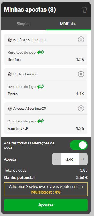 Se ganhares as 3 apostas múltiplas, as probabilidades totais são de 1,83, que serão multiplicadas pelo montante que apostares.